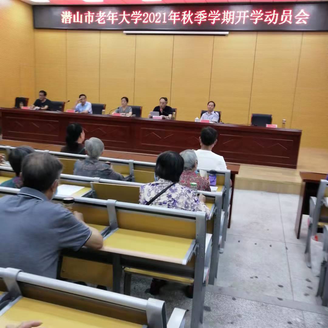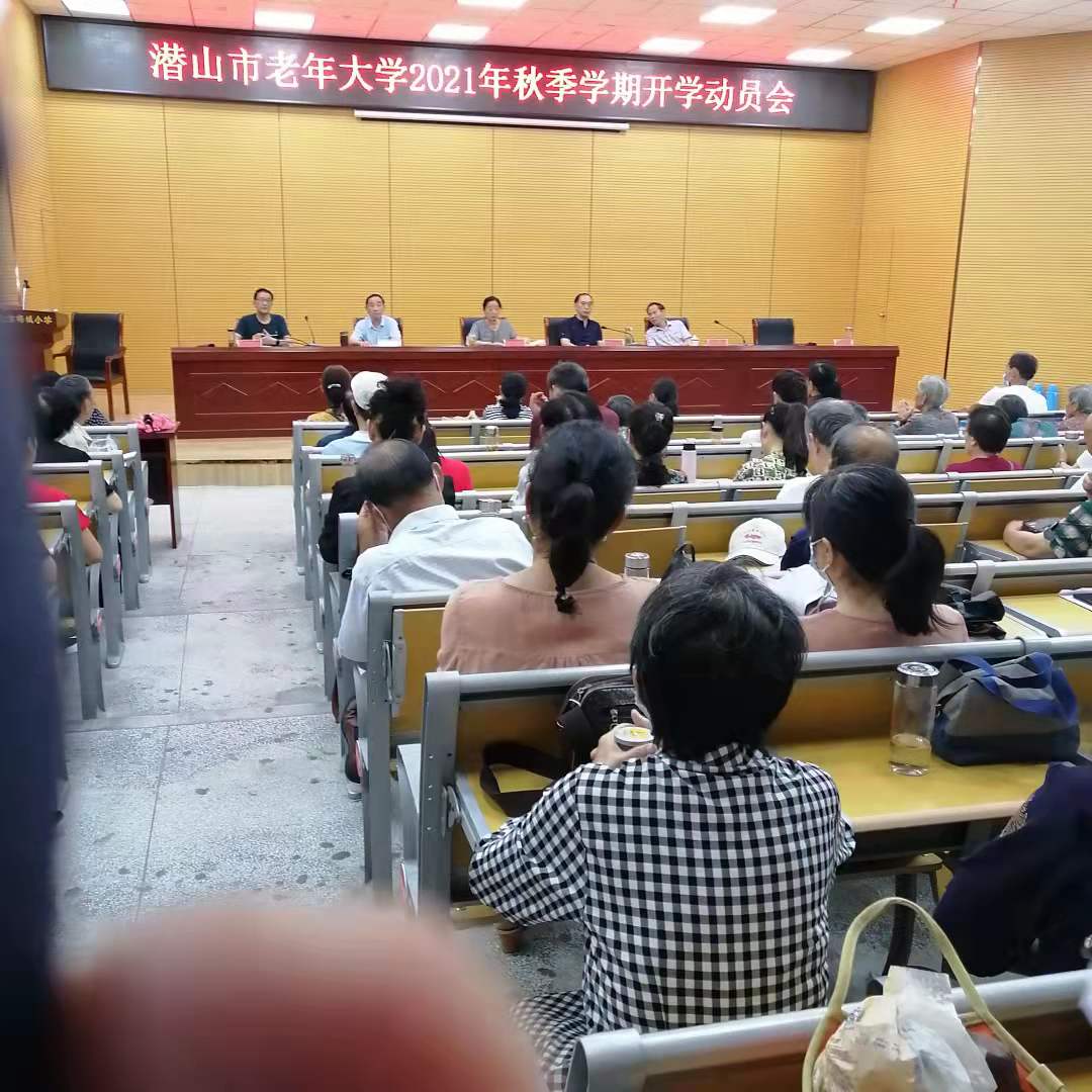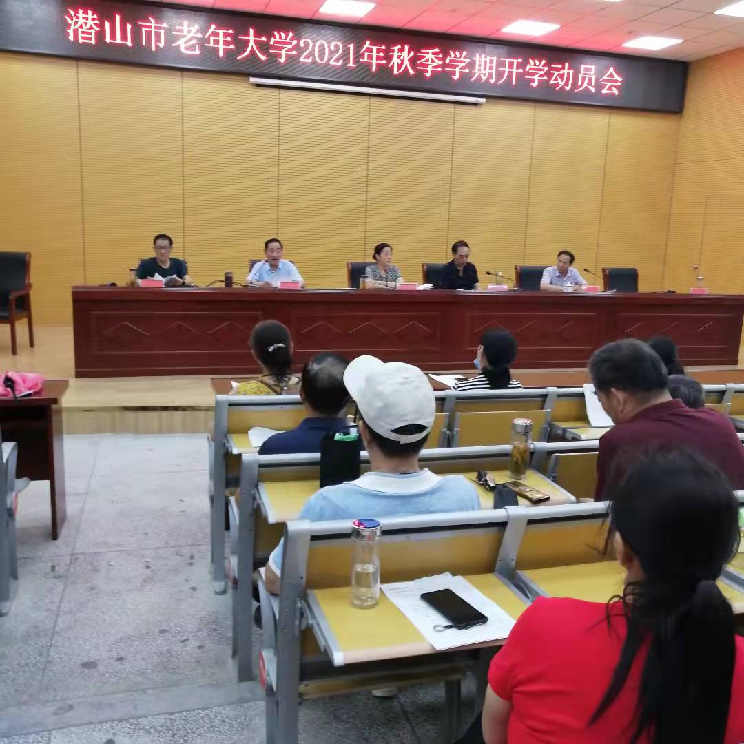 2021年9月16日,在得到市疫情防控指挥部,市组织部和市老干部局的批准,并严格按照防疫要求执行的情况下,潜山市老年大学召开了秋季学期开学动员会;大会由曹 凯副校长主持,黄晟前校长、李水云副校长、曹 凯副校长分别讲话,章士华教务长宣布了本期教学计划;本期报名的近200名学员参加了动员会,从此老年大学的线下授课活动正式开始。
